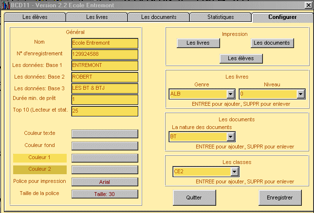 GENERAL - Permet de personnaliser le logiciel avec le nom de l'école. Il est impossible de le modifier quand le N° d'enregistrement a été validé en cliquant sur le bouton Enregistrer. Pour le modifier, éditer le fichier BCD2.ini Couleur 1 est la couleur des boîtes; couleur 2 est la couleur des grilles. Durée min. de prêt la durée en minutes pendant laquelle le prêt ne sera pas comptabilisé. Quand un enfant emprunte un livre l'heure est notée dans sa fiche lecture; si quand il le rend la durée de prêt est supérieure à celle indiquée la fiche lecteur est complétée et enregistrée. En mettant 10 (10 minutes), on permet à l'enfant de parcourir un livre et de le rendre s'il s'aperçoit qu'il a fait une erreur. En mettant une minute, on pourra voir les enfants qui se trompent souvent, ou changent d'avis ou, ou ... Top 10 le nombre de livres affichés dans les livres les plus lus et dans les statistiques le nombre de catégories affichées(Maximum 25, minimum 1) |