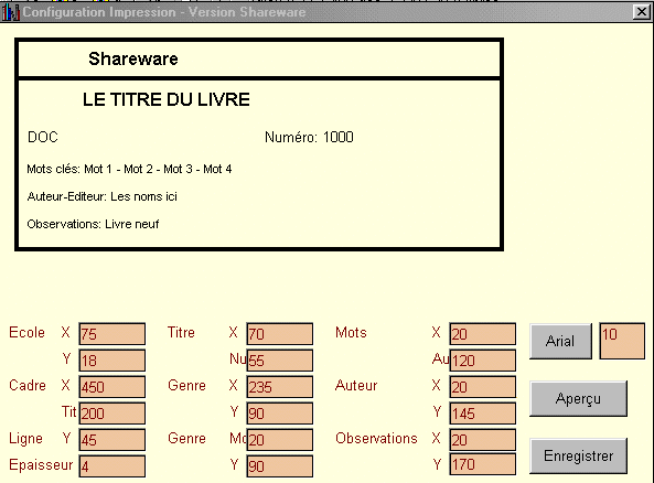 Permet de modifier l'aspect de l'impression des fiches élèves, livres ou documentX et Y sont les coordonnées de l'emplacement sur la feuille d'impression. Des essais sont nécessaires en fonction de l'imprimante. 1- Modifier les coordonnées 2- Choix de la police 3- cliquez sur Aperçu pour voir le résultat des modifications à l'écran. 4- Enregistrer les modifications Retournez à la gestion des enfants, des livres ou des documents et imprimez une fiche pour vérification. |