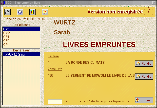 1-Choisir la classe 2-La liste des enfants s'affiche. Cliquez sur l'enfant choisi. 3-Les livres empruntés s'affichent. Cliquez sur rendre pour rendre un livre. ATTENTION pas de confirmation 4-Pour emprunter un livre: tapez le numéro du livre, puis 5-cliquez sur le bouton emprunt ou appuyez sur ENTREE. Le livre prend sa place dans la liste des livres. L'impression permet d'imprimer tous les emprunts de la classe. |