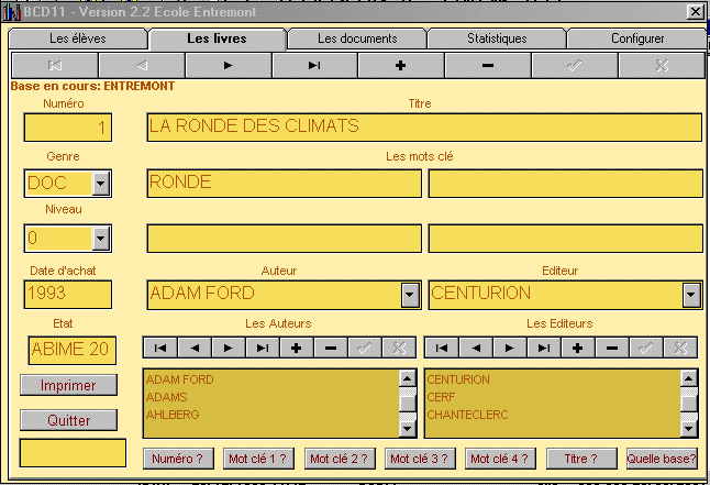 Cliquez sur "+" pour ajouter une nouvelle fiche. Remplissez les champs Numéro (attention un numéro unique pour chaque livre), titre, mots clé, genre, niveau, date d'achat et état. Pour les champs Auteur et Editeur, saisissez la ou les premières lettres, appuyez sur la flèche vers le bas: la liste s'ouvre sur l'auteur s'il existe. Un clic sur le nom permet de remplir le champ. Si l'auteur n'existe pas vous pouvez saisir son nom; il s'ajoute à la liste des auteurs.. Le cadre LES AUTEURS permet de gérer la liste des auteurs: +ajouter, -supprimer, un double clic sur un nom le modifier (cliquez sur v pour confirmer les modifications ou sur x pour les annuler) Le cadre LES EDITEURS permet de gérer les éditeurs. Zone de saisie(en bas à gauche) pour une recherche: tapez ce que vous recherchez. Le bouton NUMERO? pour Lancer la recherche de la fiche comportant le numéro saisi en 5. Le bouton MOT CLE1? pour lancer la recherche de la fiche comportant dans les mots clé le mot saisi en 5 Le bouton TITRE? pour lancer la recherche de la fiche comportant dans le titre le mot saisi en 5. Le bouton IMPRIMER pour imprimer la fiche courante pour un fichier manuel. Le bouton QUELLE BASE? permet de gérer une autre BCD |