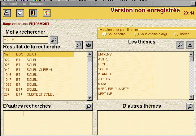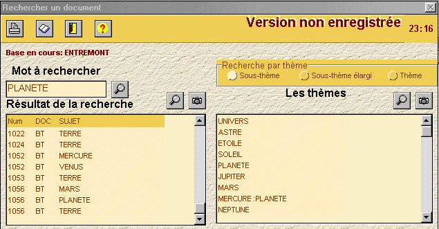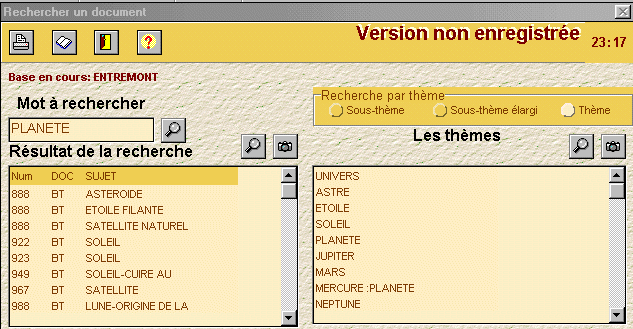 Exemple: Résultat de la recherche par thème. On a recherché le mot planète, puis dans les thèmes on a cliqué sur l'APPAREIL PHOTO qui nous a donné toutes les fiches sur le thème PLANETE qui était sélectionné. |